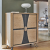 Portes bois : Panneaux de fibres moyenne densité revêtus de placage chêne avec incrustation céramique grise veinée (Dekton).