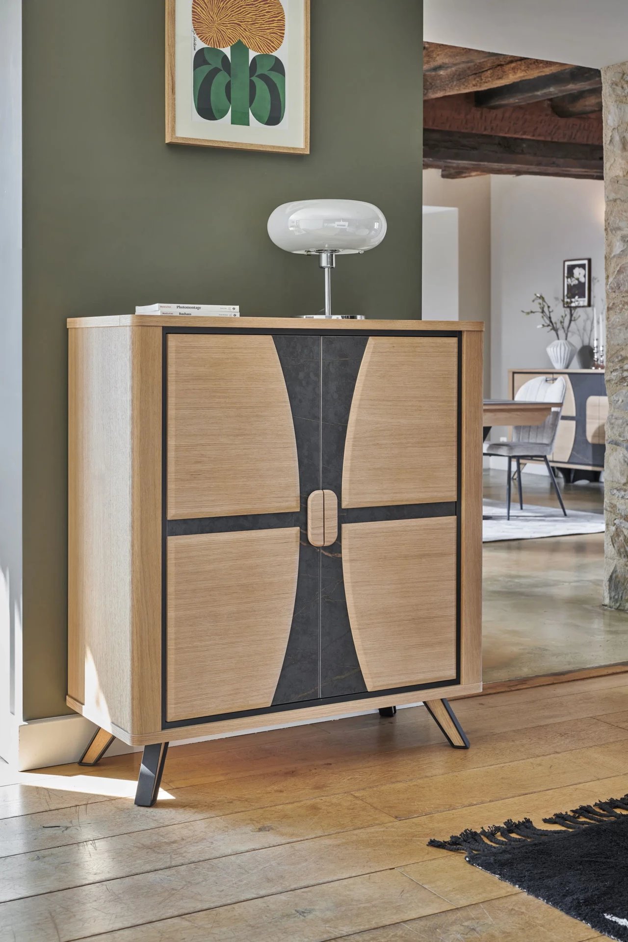 Pieds : Pieds fer finition époxy gris anthracite avec incrustation chêne massif.