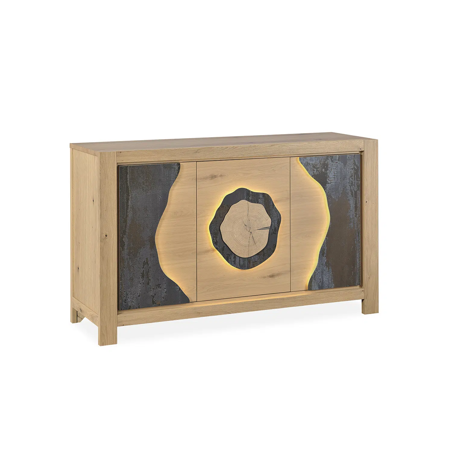 Dessus : Panneaux de particules revêtus de placage chêne avec chant bois de bout aux extrémités.